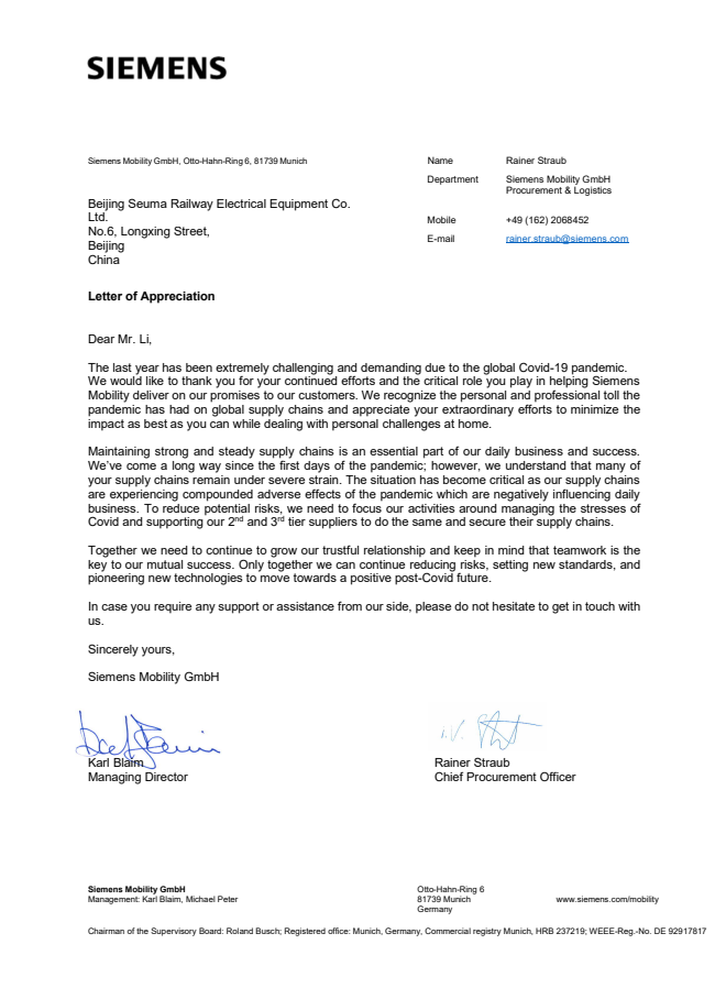 北京森瑪鐵路電氣設(shè)備有限公司成立于2007年6月,注冊(cè)資金330萬(wàn)美元,是一家生產(chǎn)鐵路電氣化設(shè)備的德國(guó)獨(dú)資企業(yè),擁有獨(dú)立的進(jìn)出口經(jīng)營(yíng)權(quán)。公司占地面積6000㎡,辦公及生產(chǎn)面積3000㎡。2008年5月公司通過德國(guó)萊曼博士認(rèn)證機(jī)構(gòu)DIN EN ISO9001:2000認(rèn)證。2011年1月通過ISO9001質(zhì)量管理體系認(rèn)證,于2018年11月成為北京市高新技術(shù)企業(yè)。